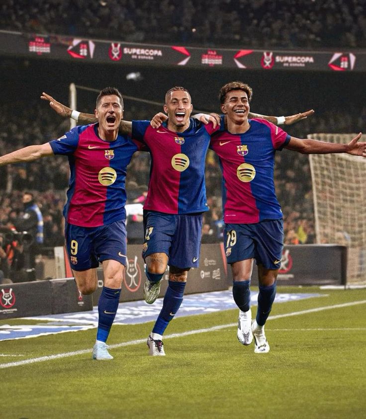 Robert Lewandowski (Nomor 9) – Striker utama Barcelona yang dikenal sebagai salah satu pencetak gol terbaik dunia. Raphinha (Kiri, Nomor 11) – Winger asal Brasil yang memiliki kecepatan dan kemampuan dribel yang baik. Lamine Yamal (Kanan, Nomor 27 atau 19) – Wonderkid berbakat yang masih sangat muda tetapi sudah menjadi andalan tim utama.